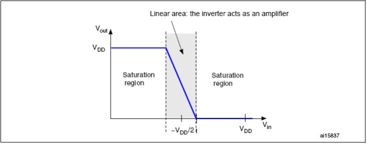 在大多數(shù)情況下,反饋電阻RF是內(nèi)嵌在振蕩器電路內(nèi)的(至少在ST的MCU中是如此)。它的作用是通過(guò)引入反饋使反向器的功能等同于放大器。Vin和Vout之間增加的反饋電阻使放大器在Vout = Vin時(shí)產(chǎn)生偏置,迫使反向器工作在線(xiàn)性區(qū)域(下圖中陰影區(qū))。該放大器放大了晶振的正常工作區(qū)域內(nèi)的在并聯(lián)諧振區(qū)內(nèi)的噪聲(例如晶振的熱噪聲),從而引發(fā)晶振起振。如果在起振后去掉反饋電阻RF,振蕩器仍可以繼續(xù)正常運(yùn)轉(zhuǎn)。